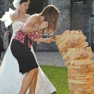 The Giant Jenga is made from solid wood. Just carefully pull one piece out of anywhere on the tower and place it on the top then let the next person try, just keep going for as long as you can. If it topples over on their turn then they lose.