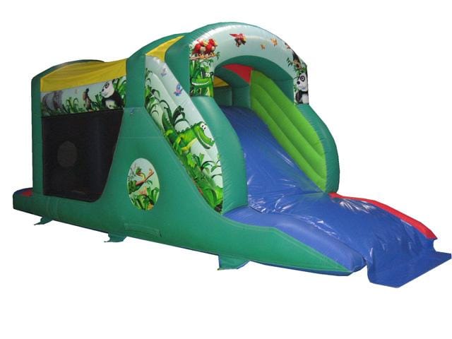 A fully featured Inflatable Fun Run with sewn in shower cover, deep bounce bed, netted sides (so parents can see the kids playing inside), superb digitally printed artwork in an exciting Jungle theme, fully webbed bed & slide sheet.