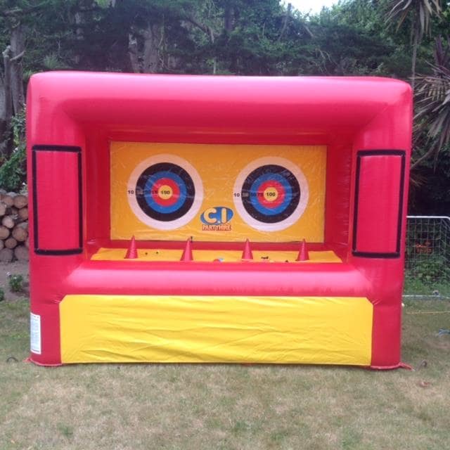 This game is one of CI Party Hire's favourite games for both kids and adults alike. It comes supplied with two small crossbows and plastic arrows with suckers on the end as well as four plastic ball that are suspended in the air above air cones. If you don't want to use the crossbows then it can also be used as an inflatable coconut shy - using tennis balls to try and knock off the suspended balls . A really good game for adults to play alongside kids!