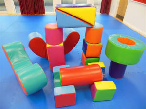 14 piece brightly coloured, foam filled soft play activity shapes set, includes two banana rockers, cylinders and blocks to build with.