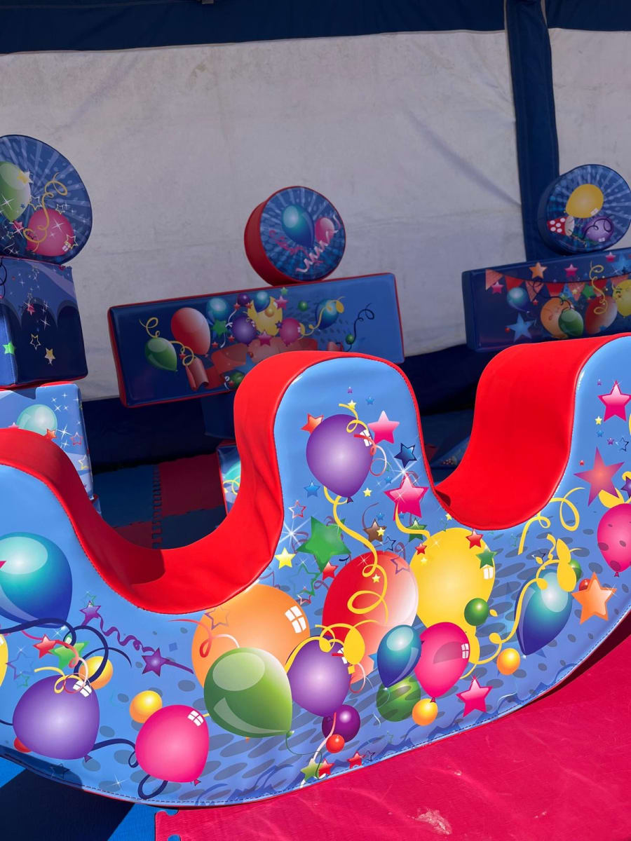 18 Piece Red and Blue Party Themed Soft Play Blocks with a matching See-Saw Rocker.